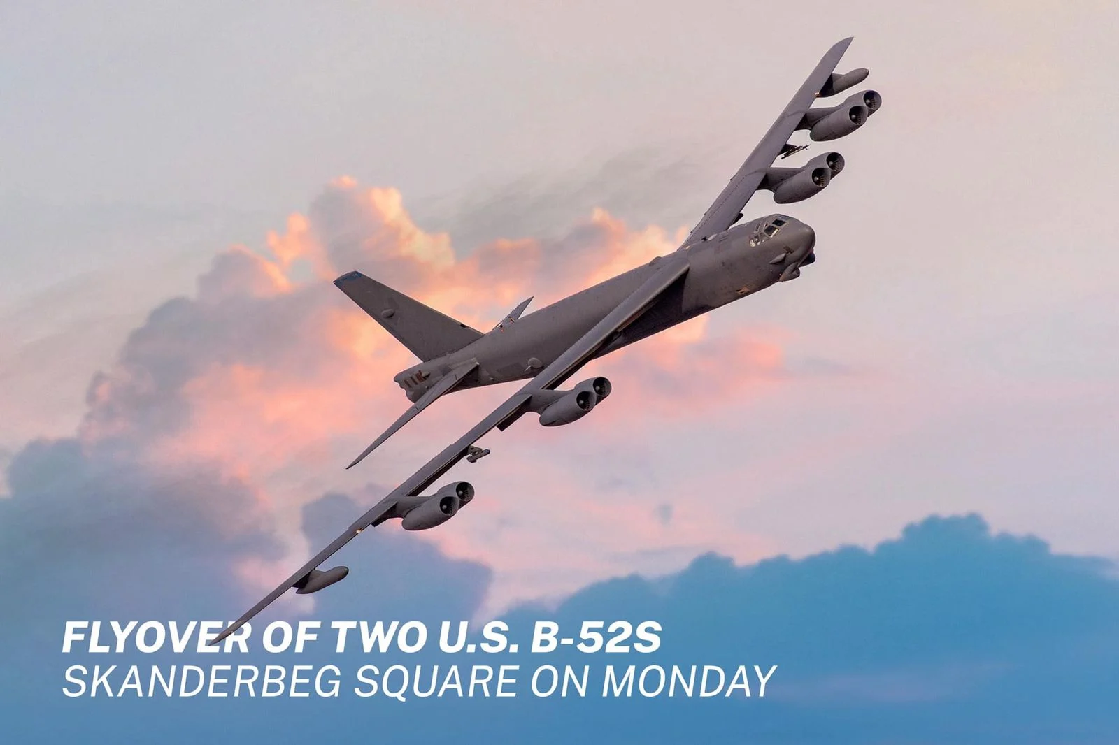 Ambasada Amerikane në vendin tonë ka njoftuar se në kuadër të 100-vjetorit të marrëdhënieve mes Shqipërisë dhe Shteteve të Bashkuara, rreth orës 15:00, dy avionë amerikanë B-52 do të fluturojnë mbi sheshin Skënderbej,