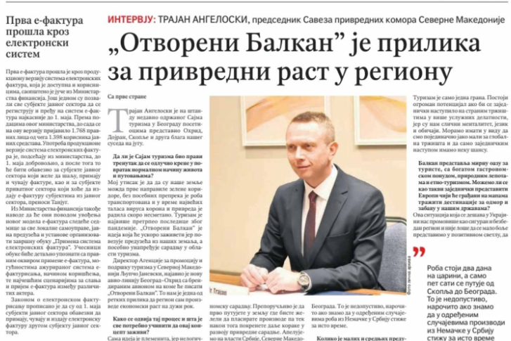 Shkup, 15 prill – “Ballkani i Hapur” është një ide e cila do të marrë jetë, sepse i lidh ndërmarrjet e vendeve tona, ndërsa veçanërisht do të kontribuojë për përparimin e bashkëpunimit në sektorin turistik si një nga sektoret më të goditur në krizë, thotë në intervistë për gazetën serbe “Politika” kryetari i Lidhjes së Odave Ekonomike (LOE), Trajan Angeloski.
