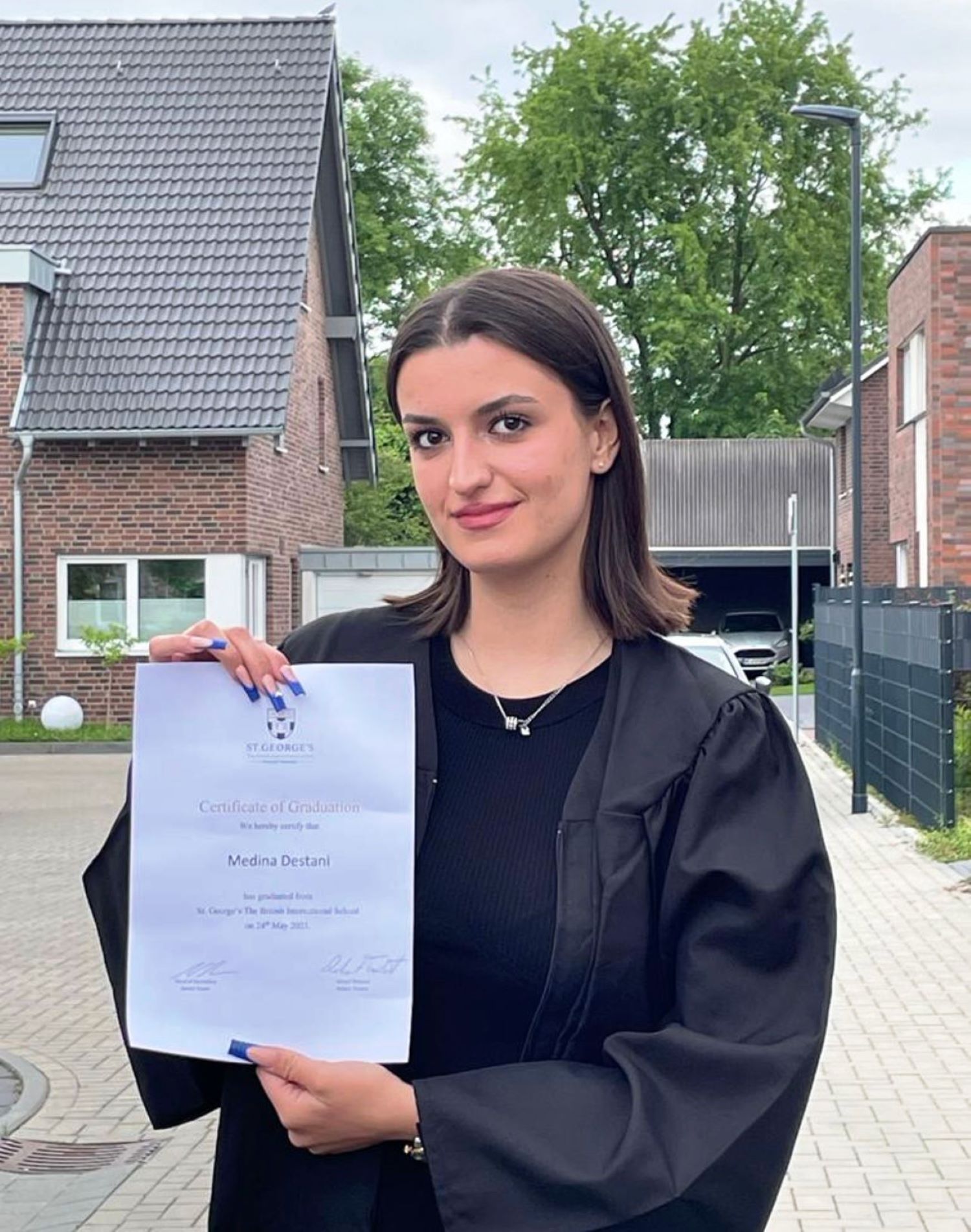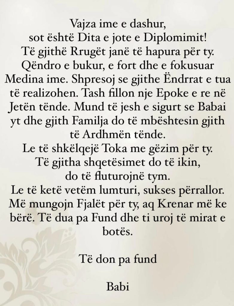“Vajza ime e dashur, sot është dita jote e Diplomimit (St. George´s – The British International School) dhe tani gjitha rrugët janë të hapura për ty. Qëndro e bukur, e fortë dhe e fokusuar Medina ime. Shpresoj se gjithë Ëndrrat e tua të realizohen. Tash fillon një Epoke e re në Jetën tënde. Mund të jesh e sigurt se Babai yt dhe gjithë Familja do të mbështesin gjithë të Ardhmen tënde. Le të shkëlqejë Toka me Gëzim për ty. Të gjitha Shqetësimet do të ikin, dhe do të fluturojnë tym. Le të ketë vetëm Lumturi, Shëndet, Sukses përrallor. Më mungojnë Fjalët për ty, aq Krenar më ke bërë. Të dua pa Fund dhe ti uroj gjithë të mirat e Botës. Të dua pa Fund”, shkruan babai Selim Destani.