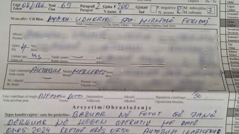 Ndaj tij, policia ka shqiptuar një gjobë kundërvajtëse prej 200 euro, 2 pikë negative, dhe për 3 muaj masë mbrojtëse, heqje e patentë shoferit.