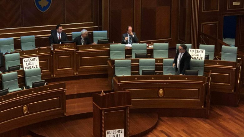 Besnik Tahiri vendos pankarta në Kuvend “Ku është ligji i pagave?”