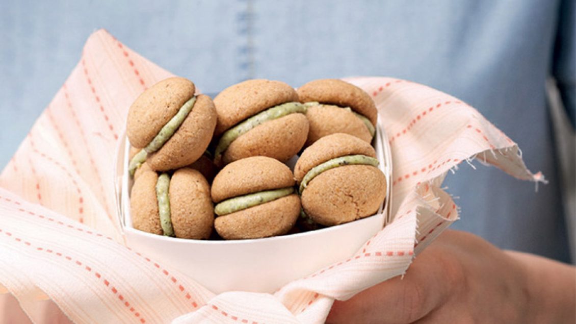 Bashkoni 2 biskota me kremin e përgatitur në formë sandviçi.