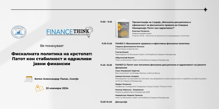 Shkup, 22 nëntor – Në organizim të Këshillit Fiskal të Republikës së Maqedonisë së Veriut dhe Finance Think, sot do të mbahet ngjarja “Politika fiskale në udhëkryq: Rruga drejt stabilitetit dhe financave publike të qëndrueshme”.