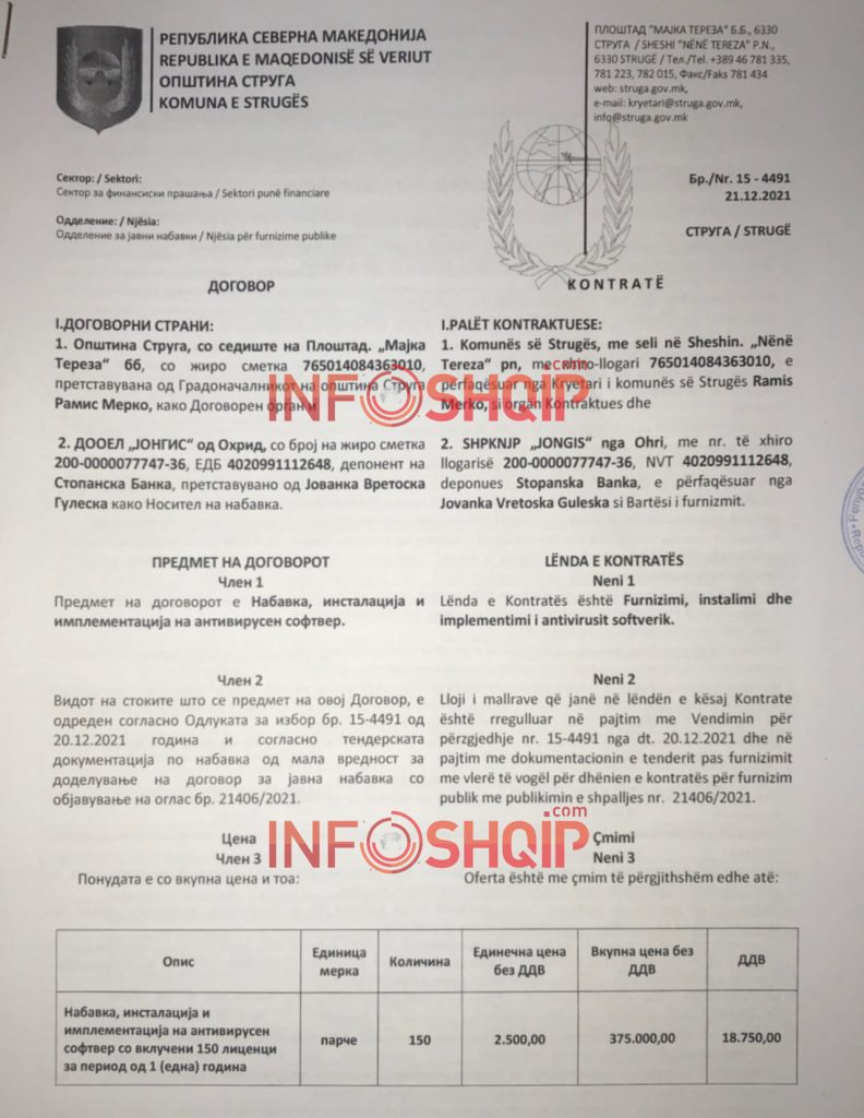 Në bazën e prokurimeve publike del se Komuna e Strugës me datë 21 Dhjetor ka nënshkruar marveshje për blerjen e 150 licencave të antivirusit nga kompania “Jongis” nga Ohri dhe në tender specifikohet se kompania në fjalë duhet të bëjë edhe instalimin e antiviruseve në kompjuterët e komunës. Poashtu në tender specifikohet se aktualisht Komuna e Strugës përdor antivirusin e llojit “Kaspersky Endpoint Security” dhe kompania që ka fituar tenderin duhet ta de-m instalojë softuerin aktual dhe të instalojë softuerin e ri por pa u specifikuar se çfarë modeli antivirus do instalohet.