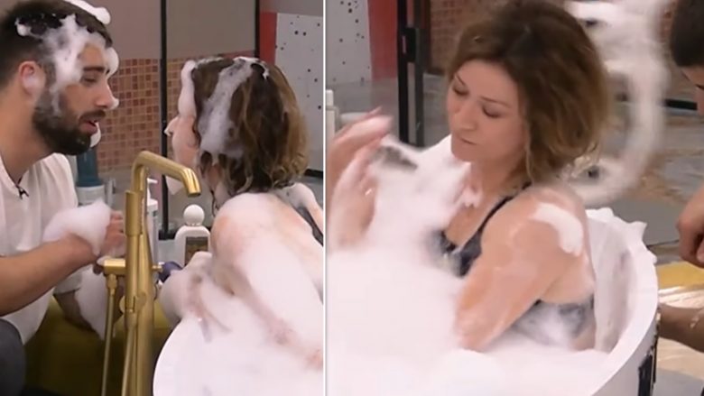 Në një tjetër video, Egla shihet duke e mbuluar me shkumë Meritonin, i cili u revoltua dhe kërkoi që të mos e prekte.