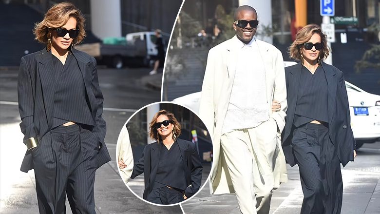 Rita Ora dukej sikur bënte biznes të enjten ndërsa ecte rreth Sydneyt e veshur me një kostum të hirtë me tri pjesë përpara lansimit të linjës së saj të re të kujdesit të flokëve, “Typebea”.