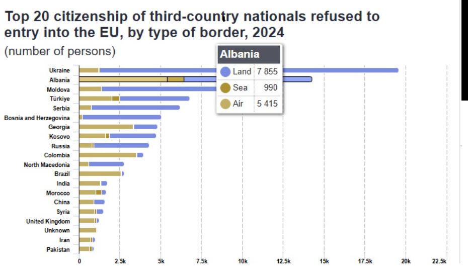 Bruksel, 23 maj – Shqiptarët janë të dytët më të refuzuarit në kufijtë e Bashkimit Europian, pas ukrainasve (19 595). Në total në kufijtë tokësor, ajror dhe detar në vitin 2024 janë refuzuar 14,260 shtetas shqiptar, ku gjysma në kufijtë tokësorë (7855). Gjysma e totalit janë refuzuar në shtet fqinjë, Greqi dhe Itali, ndërsa pjesa tjetër e shpërndarë në Lituani, Hungari, Gjermani etj.