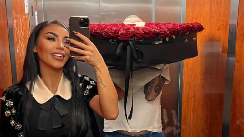 Fjolla ka publikuar një imazh ku shihet përkrah një mashkulli, i cili fytyrën e ka të mbuluar me një buqetë të madhe trëndafilash të kuq.
