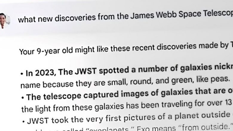Një shembull i përfshirë në video tregon një përdorues që pyet Bardin, “Për çfarë gjetjesh të reja nga teleskopi hapësinor James Webb mund t’i tregoj 9-vjeçarit tim?” – Chatbot u përgjigj duke pretenduar se teleskopi James Webb ishte përdorur për të kapur imazhet e para të planetëve jashtë sistemit diellor të Tokës.