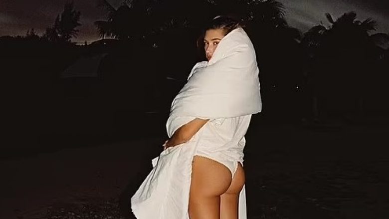 Hailey Bieber është shfaqur me të brendshme të bardha, ndërsa mbante një batanije rreth shpatullave.