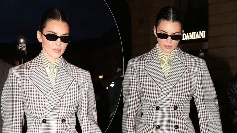 Kendall Jenner shkëlqeu në Javën e Modës në Paris, duke tërhequr vëmendjen me një kombinim xhakete elegante, këmishë me vija dhe kravatë.