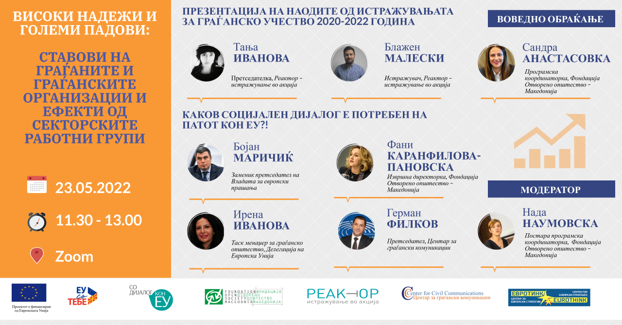 Në mesin e folësve të konferencës janë zëvendëskryeministri për Çështje Evropiane, Bojan Mariçiq, Sandra Anastasovska, koordinatore programuese e Fondacionit Shoqëri e Hapur – Maqedoni, Tanja Ivanova kryetare e Reaktor – Hulumtim në aksion…