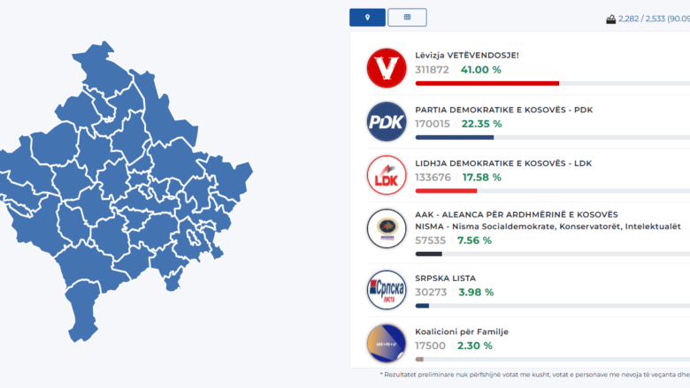 Komisioni Qendror i Zgjedhave ka dal me statistika të reja deri në orën 11:04, ku janë numëruar 90.09 për qind e votave, sipas së cilave, Lëvizja Vetëvendosje prin me 41.00 për qind, pasuar nga Partia Demokratike e Kosovës me 22.35 për qind, Lidhja Demokratike 17.58 për qind, e katërta me radhë është AAK-Nisma me 7.56 për qind të votave.