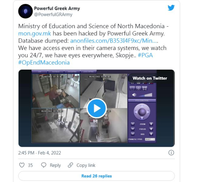 Shkup, 7 shkurt – Pas njoftimeve se Ministria e Arsimit është sulmuar nga disa hakerë grek, sot kjo ministri doli me sqarim duke treguar se ka patur tentim për sulm mirëpo pamjet që janë publikuar nga sulmuesit, janë të rreme dhe nuk përkojnë me kamerat e sigurisë në ministri, informon Zhurnal.