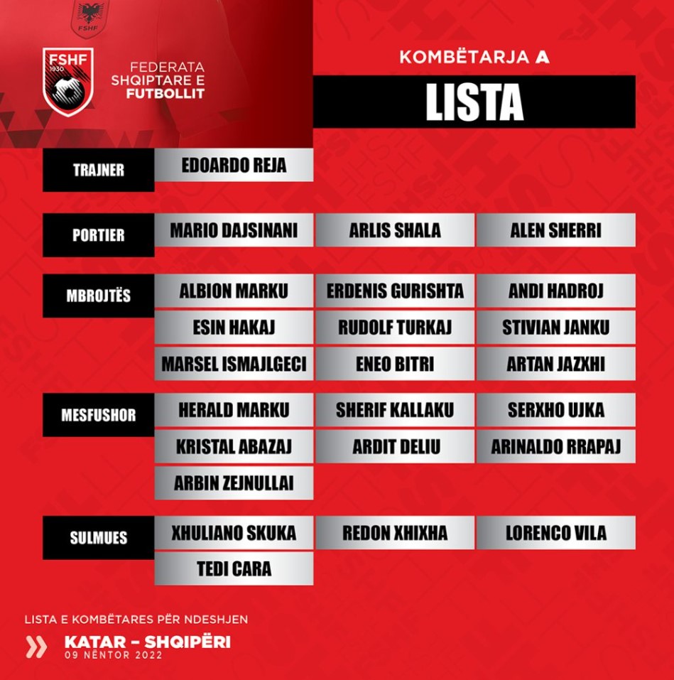 Më poshtë edhe lista me emrat e 23 lojtarëve të ftuar në Kombëtare për miqësoren e radhës me Katarin: