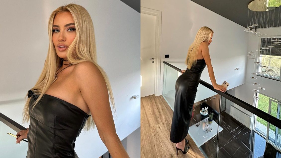 Ky fustan elegant prej lëkure, shfaq me lehtësi linjat joshëse të bukuroshes, duke ia hedhur në pah edhe mesin tejet të hollë.