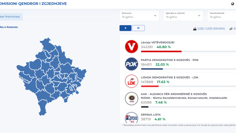 Tashmë në ueb faqen e KQZ-së figuron që numërimi i votave ka përfunduar 100% në 2 mijë e 533 vendvotime.