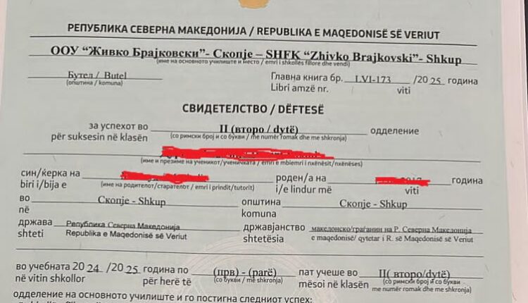 Shkup, 26 qershor – M.I, një prind nga Shkupi, ka reaguar publikisht ndaj një vendimi të ri në shkollën fillore “Zhivko Brajkovski” në Komunën e Butelit, ku djali i tij – nxënës shqiptar – ka marrë dëftesën përfundimtare me faqen e parë vetëm në gjuhën maqedonase, ndërsa përkthimi në gjuhën shqipe figuron vetëm në faqen e dytë.