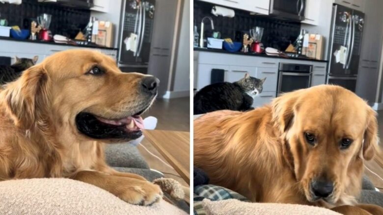 Golden retrieveri me emrin Shadow fitoi zemrat e përdoruesve të TikTok-ut falë reagimit komik ndaj një shoqërie të papritur në divan – macja e pronares së tij, Kris.
