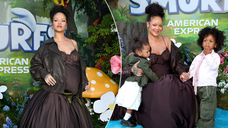 Rihanna ka tërhequr vëmendjen në tapetin e kuq të premierës së filmit të animuar “Smurfs” në Los Angeles, ku u shfaq për herë të parë publikisht me të dy djemtë e saj, RZA dhe Riot.