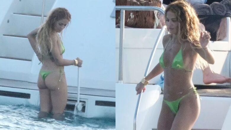 Rita Ora ‘ngriti temperaturat’ me bikini jeshile, teksa po shijonte një ditë jahti në Ibiza të shtunën.
