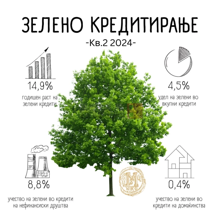 Në fund të tremujorit të dytë të vitit 2024, sipas të dhënave të Bankës Popullore, gjendja e “kredive të gjelbra” në bilancet e bankave arrin në 20.423 milionë denarë. Për dallim, në fund të vitit 2019 ato arritën në 7.176 milionë denarë. Në përfundim me tremujorin e dytë të vitit 2024, gjendja e kredive të miratuara për kompanitë është 19.407 milionë denarë, ndërsa të amvisërive është 1016 milionë denarë.