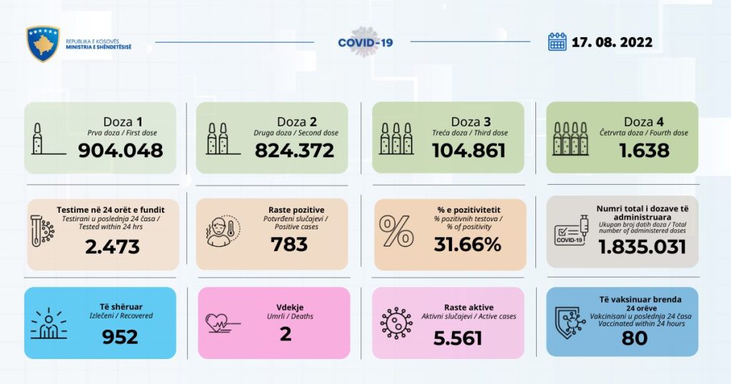 Sot dy vdekje dhe 783 raste të reja me COVID-19