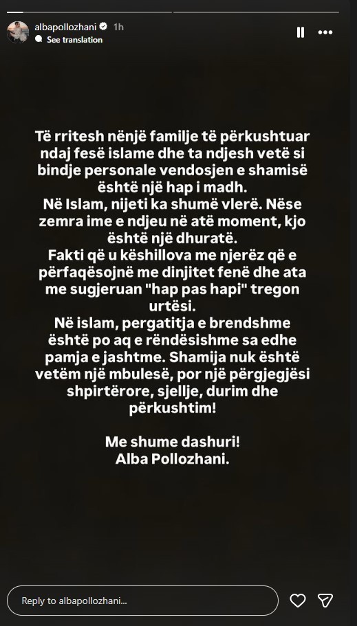 Pas këtij momenti televiziv, Alba ka zgjedhur t’i sqarojë më qartë ndjesitë dhe arsyet e saj përmes një InstaStory, ku flet për procesin personal dhe shpirtëror që po përjeton.