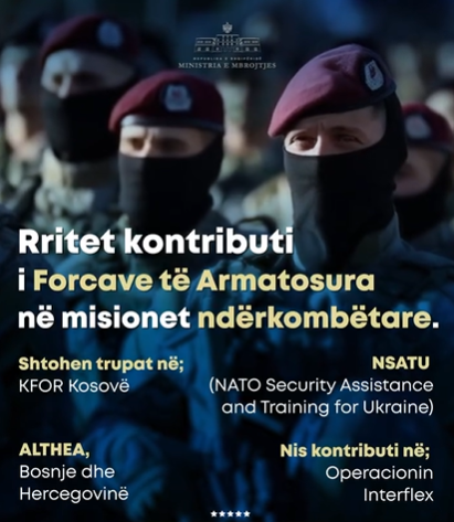 “Në vitin 2025, FA do të ketë prani të shtuar me 50 trupa në misionet e KFOR në Kosovë, ALTHEA në Bosnjë dhe Hercegovinë, NSATU dhe Operacionin Interflex, dy të fundit në mbështetje të Ukrainës, duke konfirmuar dinamizmin e angazhimeve te Shqipërisë  në mbështetje të paqes, sigurisë dhe stabilitetit në botë”, nënvizon Vengu në një postim në rrjetet sociale.