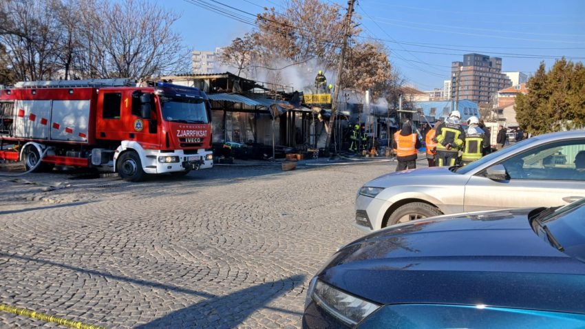 Një numër i madh i zjarrfikësve ndodhet te Tregu i Gjelbër, për të shuar zjarrin që kaploi disa lokale.